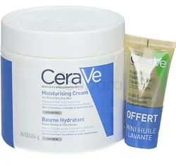 Ce pack contient BAUME HYDRATANT PEAUX SECHES A TRES SECHES 473ML + HUILE MOUSSANTE HYDRATANT 15ML OFFERT. -Développé avec des dermatologues, le Baume Hydratant Cerave nourrit, hydrate et aide à restaurer la barrière protectrice de la peau. Ce soin nourrissant, enrichi aux 3 céramides essentiels et acide hyaluronique hydrate la peau en continu, dès la première application. -L'Huile Lavante Moussante Hydratante Cerave nettoie en douceur, relipide et nourrit les peaux normales à très sèches et les peaux à tendance atopique. Véritable soin lavant, sa formule enrichie aux 3 céramides essentiels et à l'acide hyaluronique restaure la barrière cutanée et hydrate la peau sous la douche. Formulée à partir d'un complexe unique de triglycérides et de squalane, lipides clés naturellement présents dans la peau, déficitaires dans les peaux les plus sèches, et d’une base lavante douce formulée à partir d’acides aminés, l’Huile Lavante Moussante Hydratante Cerave nettoie tout en relipidant la peau.